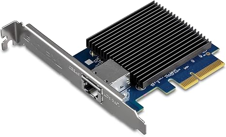 The TRENDnet 10Gb network card includes an RJ-45 Ethernet port and four PCIe 3.0 interfaces. It converts any PCIe 3.0 or 2.0 slot into a 10G Ethernet port. It also supports 5G and 2.5G speeds over Cat5e lines with a maximum distance of 100 meters. It works with most Windows versions, including Windows Server 2016 and 2012, and Windows 10 and 8.