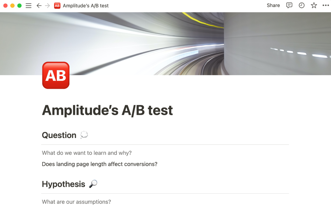 It is the top digital optimization system. It provides insight into tailoring experiences to each client and gives teams a consistent lens through which to view data. Avoid context switching by linking straight to your Amplitude charts and data! Use this template for a context-driven A/B test, closing the loop between data, insight, and action.