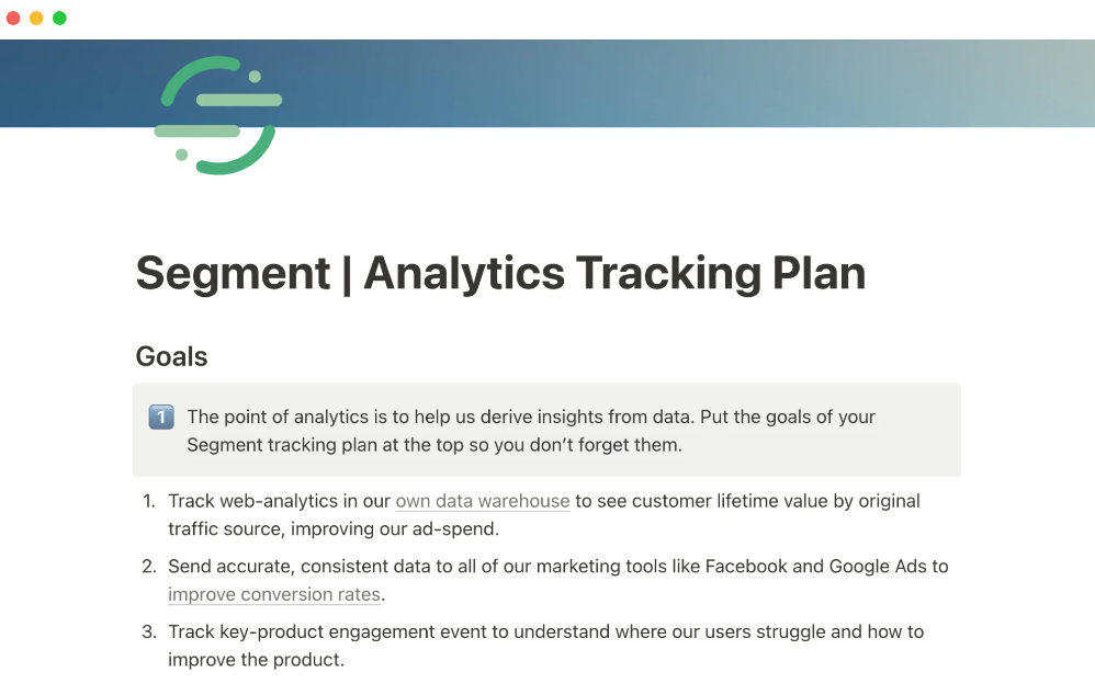 The template enables a marketing or product manager to clearly, consistently, and easily describe all events, identify and group calls required to make their Segment instance relevant and achieve their analytics goals.