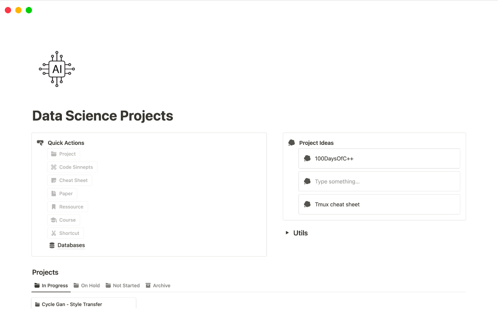 Notion's remarkable flexibility enables the seamless creation of a dedicated workspace tailored for efficiently managing data science tasks. Its high level of adjustability and adaptability ensures that it can easily meet any future requirements while offering all the necessary tools and resources in a unified workstation.