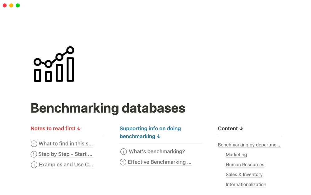 This template enables teams and individuals to implement benchmarking interactively. It provides indicators for finance, marketing, e-commerce, and other areas that allow you to compare and analyse performance.