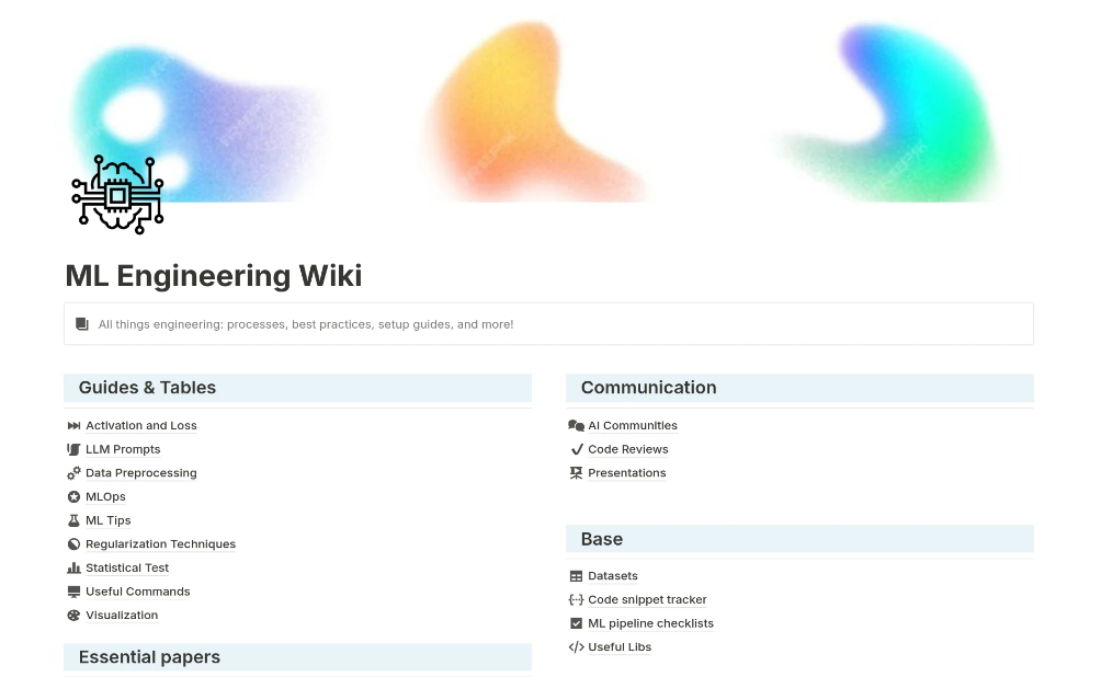 The Notion ML, Engineering Wiki template, is a comprehensive and flexible resource for developing machine learning applications. This template, which includes checklists, expert guidance, curated resources, and best practices, assists machine learning engineers in simplifying their processes and achieving optimal results.