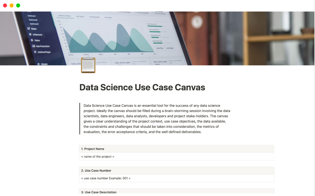 Data Science Use Case Canvas is a critical tool for the success of any data science effort. Ideally, the canvas should be completed at a brainstorming session, including data scientists, engineers, data analysts, developers, and project stakeholders. The canvas provides a clear overview of the project context, use case objectives, available data, limitations and obstacles to consider, evaluation metrics, error acceptability criteria, and well-defined deliverables.