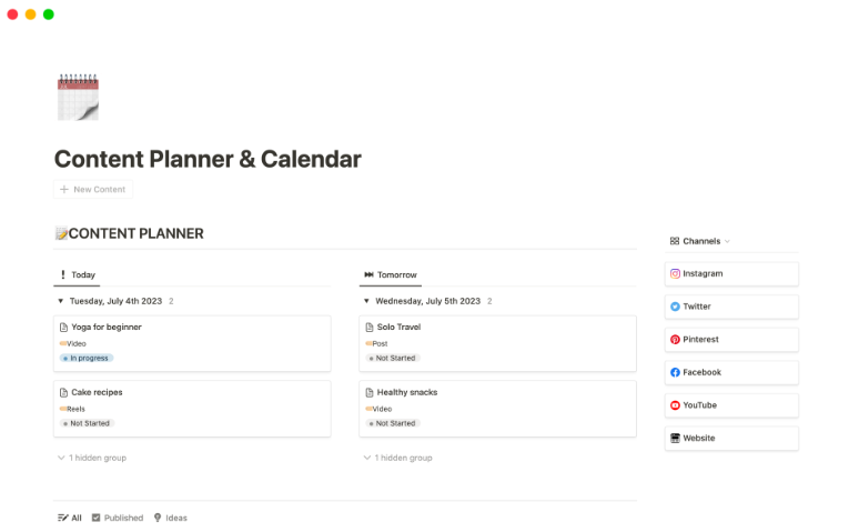 An all-inclusive solution for thorough content strategy and organization. It includes a customizable design with ten pre-set channels, each with its own dashboard, a creative content idea hub, a Kanban-style content pipeline, and many calendar views for detailed planning. It is ideal for managing content across numerous platforms such as LinkedIn, Twitter, YouTube, and Instagram, simplifying and improving the content generation and distribution process.