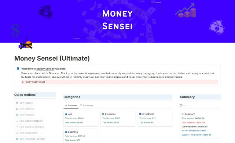 Achieve financial mastery with this Notion calendar template, which serves as a thorough method for recording and managing your finances. It includes a simple dashboard for tracking income, expenses, and financial objectives, as well as specialized trackers for subscriptions and automatic payments. This template is ideal for providing clarity and control to your financial life by combining budget planning and expense monitoring into one organized space.