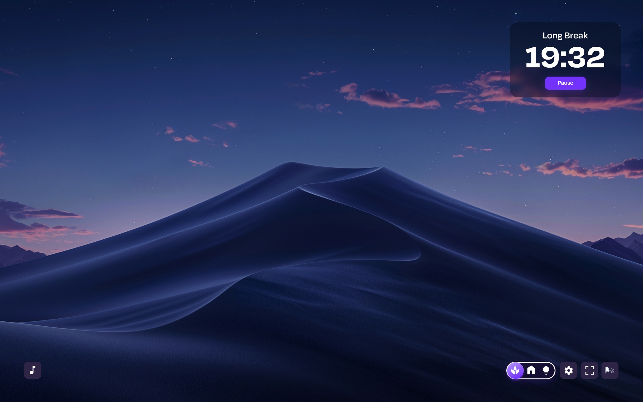 Start your day well with the Home dashboard, which includes a bold clock, inspirational phrases, and dynamic greetings. Set your work intentions and a personalised Pomodoro timeframe to find your flow in Focus Mode. Ready to take a break? Switch to the minimalist Ambient Mode, listen to soothing lo-fi or jazz hop mixes and journey to one of several distinct Flocus worlds!